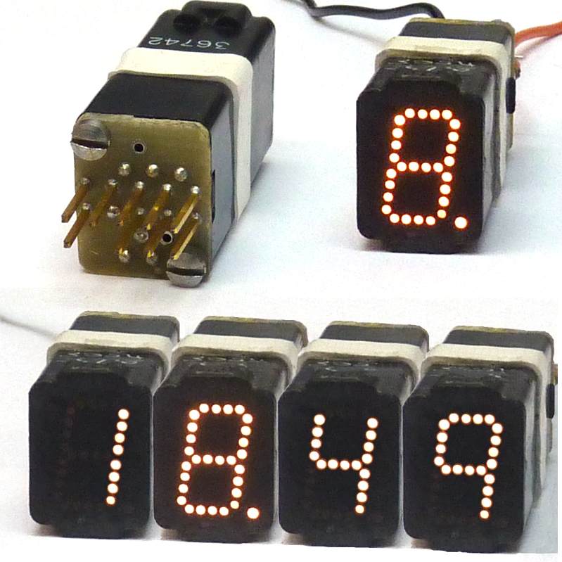 AF 8499 Siebensegmentanzeigen Hier ein interessanter Artikel für die Uhrenbauergilde und die Displaysammler: Digitalanzeige, 7-Segment mit Dezimalpunkt, mit Lämpchen betrieben: In der hinteren Ebene der Anzeigebaugruppe sitzen 8 Lämpchen, deren Licht über Glasfaserbündel auf die Front übertragen wird. Jedes der 7 Segmente besteht aus 4 einzelnen Leuchtpunkten. Stellt man die Ziffer 8 dar, leuchten also 28 kleine, helle Punkte. Man staunt, was es alles gegeben hat...! Leuchtziffergröße: ca. 6 x 12 mm. Betriebsspannung: ca. 6 V DC (+5...+9 V) Hier handelt es sich um ausgemusterte Ware, d.h. i.d.R. ist ein oder ein paar Lämpchen kaputt. Die Displays lassen sich problemlos zerlegen, die Lämpchen kann man wechseln, die Löterei ist aber fummelig. Hardcore-Löter können natürlich auch superhelle LED einbauen. Wir liefern immer einen Satz von sechs Stück und legen ein Exemplar als Ersatzteilspender gratis bei. Preis für einen Sixpack: EUR 12,-/EUR14,28 (excl./incl. MWSt.) Angaben zur Produkthaftung: Dieser Artikel ist eine Antiquität. |