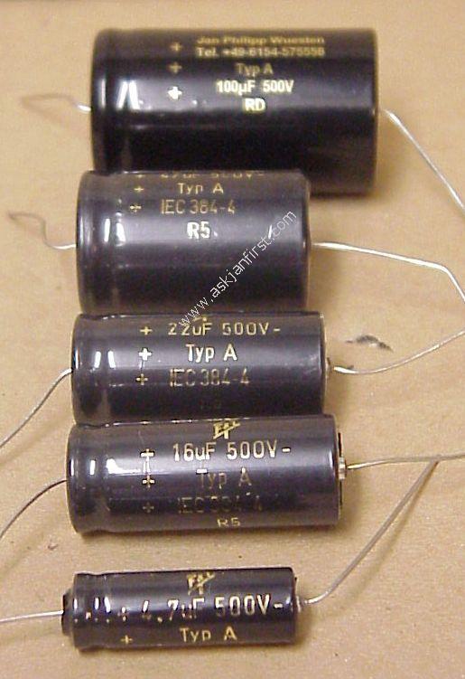 Elkos mit Lötfahnen für die Reparatur von US-Verstärkern oder den Verstärkerselbstbau | Electrolytics with solder lugs for amps repair and new construction, to be mounted with bracket | Condensateurs avec contacts radials pour construire ou reparer les amplificateurs BF etc. Montage méchanique avec un collier. | ||||||