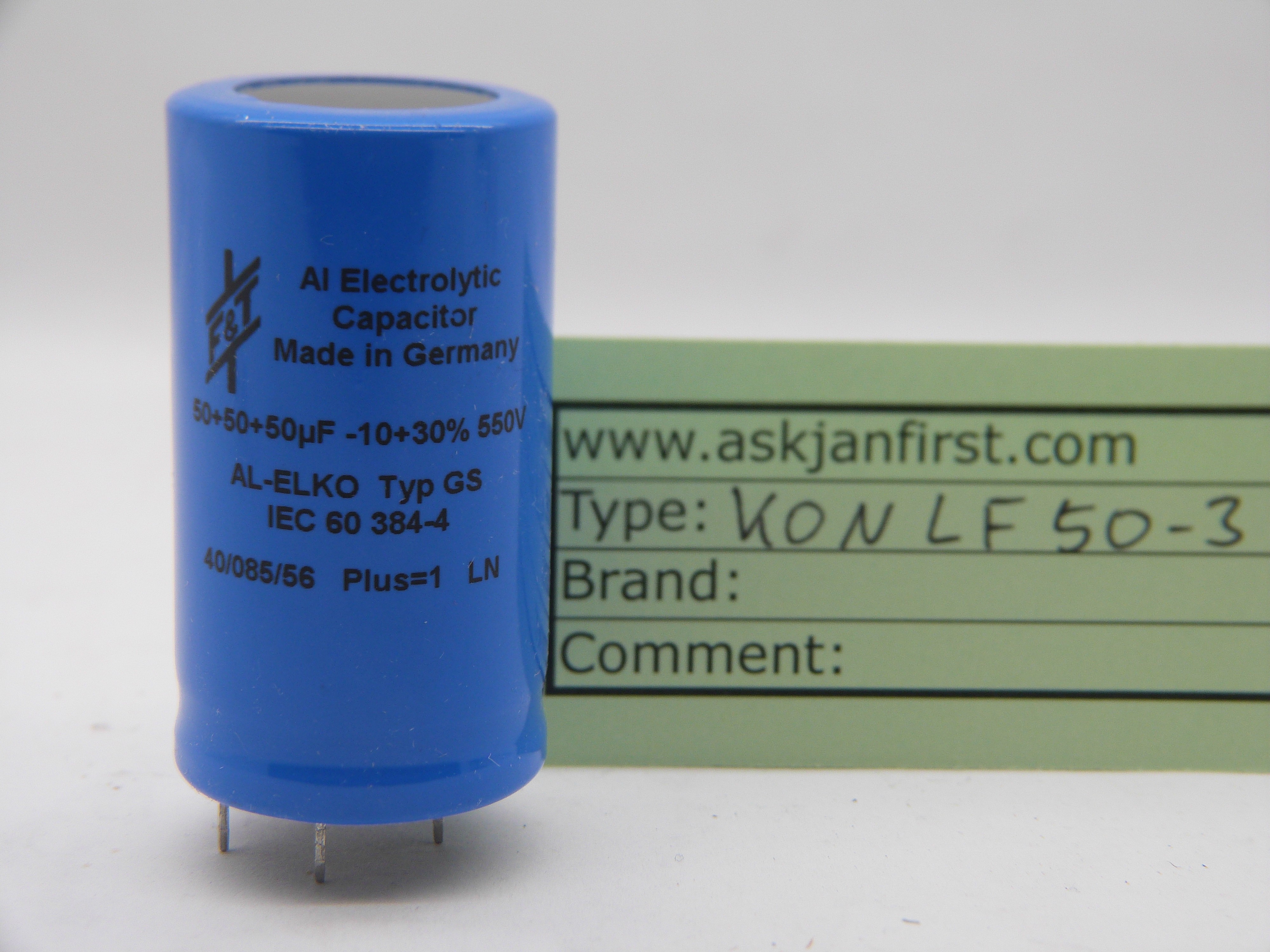 Radial electrolytic, current manufacture Triple-50 µF 550V (!) very very compact design, 30mm diameter, use in TVsets, as retrofit to fill cans, on PCBs and also for free wiring, pins allow both options. Use where space is REALLY CONFINED | Triple chimique, 3 * 50 µF 550 V Fabriqué en Allemagne, 30 mm de diamètre, très très très compacte pour utilisation dans les TV, comme retrofit, dans les amplis compacts, tuners etc. Excellent ou l´espace est vraiment très limité. | 22,17 | 26,38 | FTCap