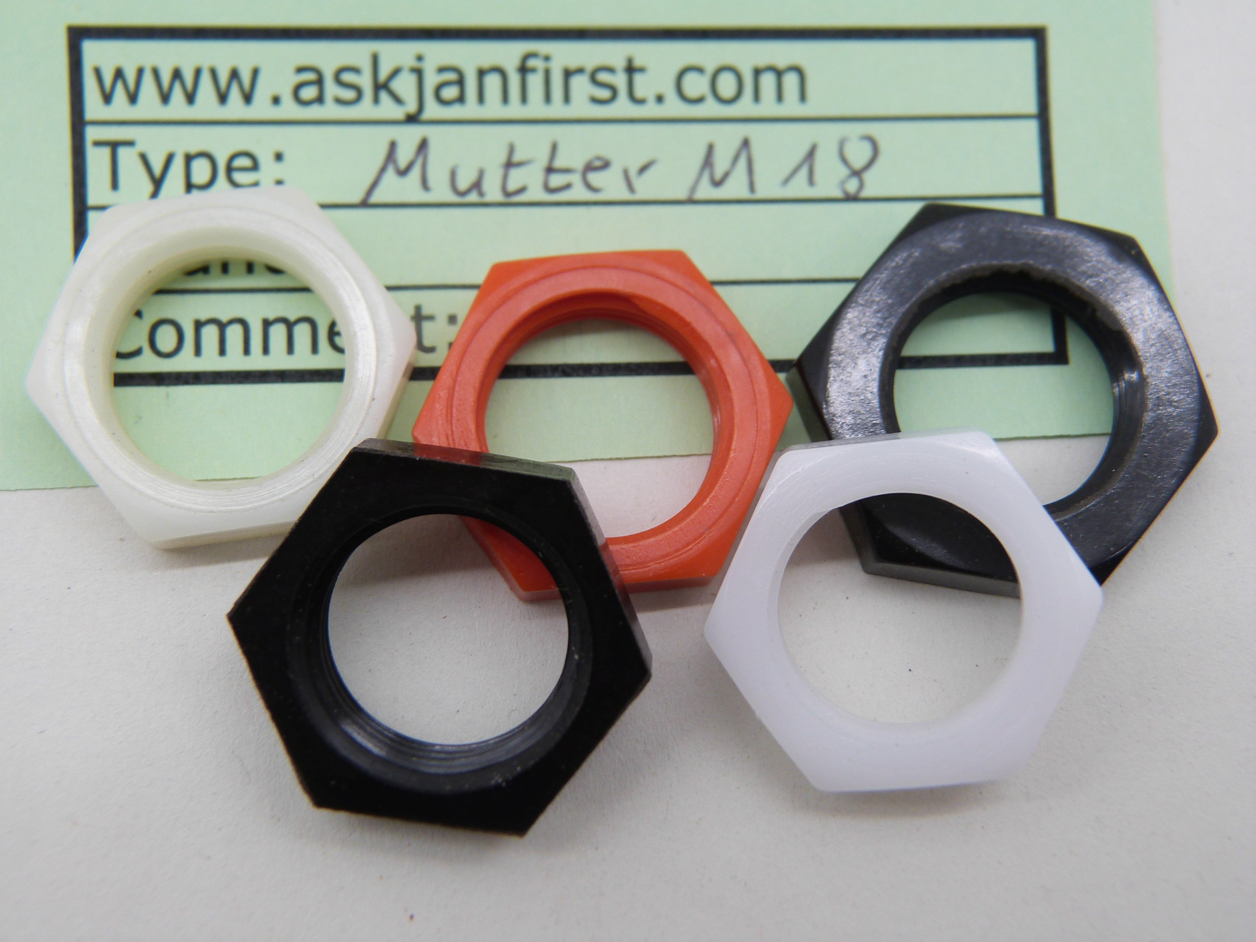 Mutter | Ersatzmutter M18, Farbe nach Verfügbarkeit (natur, schwarz, orange) | Replacement nut, M18, 18mm for european screw mount caps. | Ècrou M18, 18mm pour chimiques, pièce de rechange | 0,70 | 0,83 | FTCap